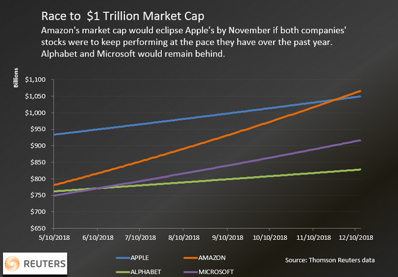 Если темпы роста сохранятся, Apple станет стоить 1 трлн долларов в сентябре, Amazon — в октябре. Компания Microsoft дойдет до 1 трлн долларов в начале 2019 года, а Alphabet — в 2020 году.