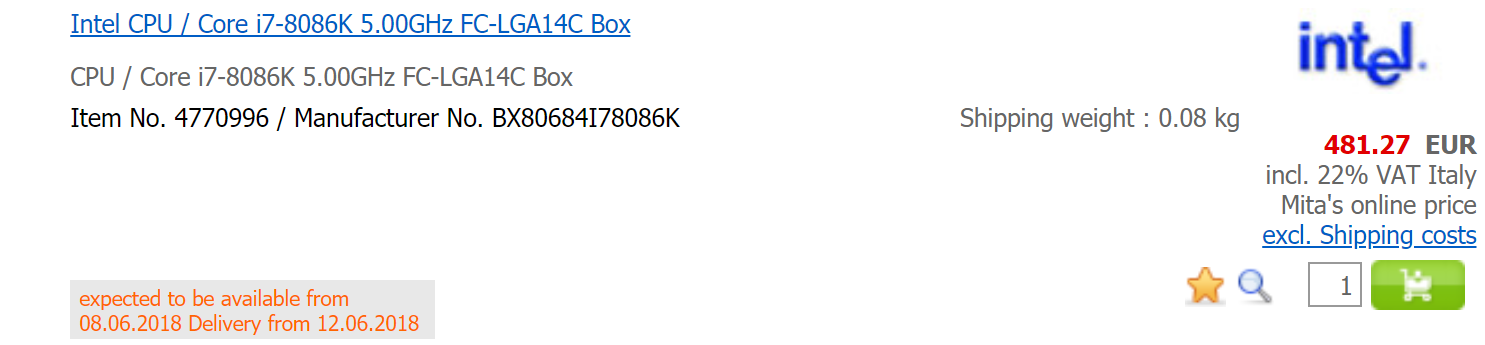 Мы уже сообщали, что 40-летие процессора 8086 производитель намерен отметить выпуском модели Core i7-8086K. Хотя 8 июня еще не наступило, некоторые онлайновые магазины добавили новинку в свои каталоги.
