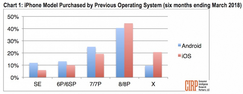 Ещё один вывод можно сделать из диаграммы источника. Тех, кто перешёл с Android на iOS и выбрал iPhone X, всего около 10%, а вот пользователей, которые перешли с другого смартфона Apple на iPhone X, вдвое больше.