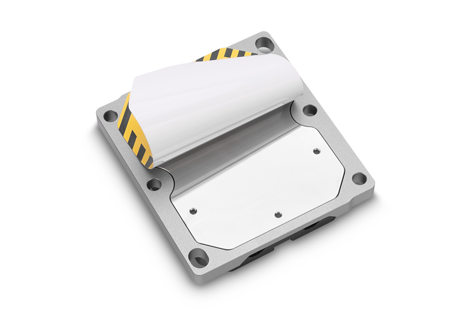 В общей сложности EK-Annihilator EX/EP Square имеет шесть портов. Два верхних — резьбовые G1/4, четыре боковых порта — резьбовые G1/8. Медное основание водоблока никелировано. Крышка изготовлена из пластика POM Acetal, а квадратный кронштейн для крепления — из алюминия.