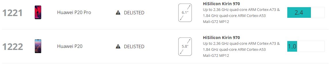 За «читгейт» Huawei никто наказывать не стал, но в UL (она принадлежит Futuremark) после проведения собственных измерений, в результате которых смартфоны Huawei продемонстрировали примерно на 35% меньшую производительность (запускался обезличенный вариант приложения, и смартфон не мог определить, бенчмарк ли это, или просто какая-то игра), решили исключить из общего рейтинга четыре смартфона китайской компании: Huawei P20 Pro, Huawei Nova 3, Honor Play и Huawei P20. Точнее сказать, в общей таблице они присутствуют, но с нулевыми результатами — и на нижних позициях.