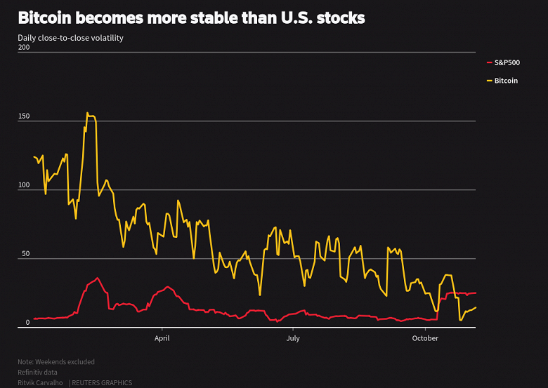 Более того, волатильность самой известной криптовалюты стала ниже, чем волатильность акций крупнейших американских компаний, входящих в индекс S&P500.