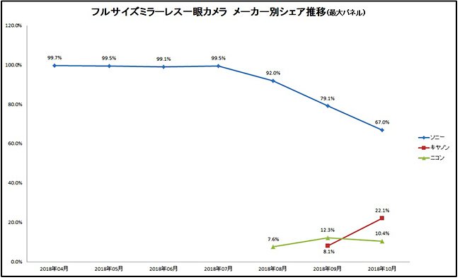 Ресурс BCN Ranking, оперирующий данными японской розничной торговли, опубликовал свежие сведения о распределении рынка полнокадровых беззеркальных камер. Как видно на графике, доля Sony, еще летом составлявшая 100%, резко сократилась всего за два месяца после выхода камер Nikon Z7 и Canon EOS R. По состоянию на октябрь доля Sony составляет 67%, Canon — 22,1%, Nikon — 10,4%.
