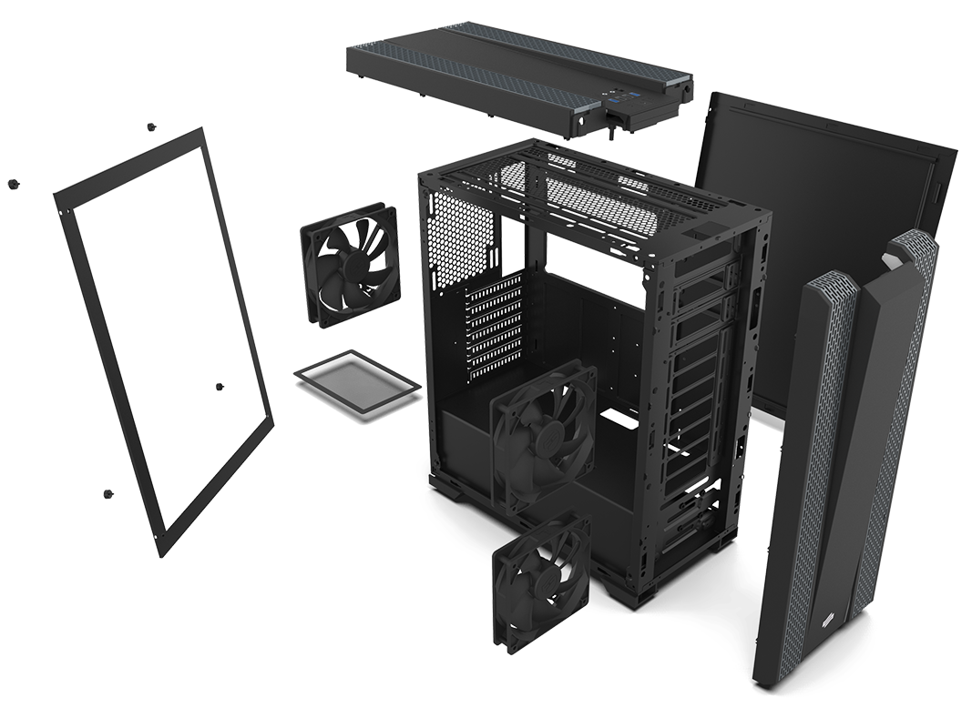 Корпус поддерживает установку системных плат формата вплоть до ATX. Есть возможность установки семи плат расширения, видеокарт длиной до 370 мм, процессорного охладителя высотой до 178 мм и шести 120-миллиметровых вентиляторов. А вот большого количества накопителей тут установить не выйдет — есть место лишь для двух моделей формата 2,5 дюйма и пары HDD типоразмера 3,5 дюйма.