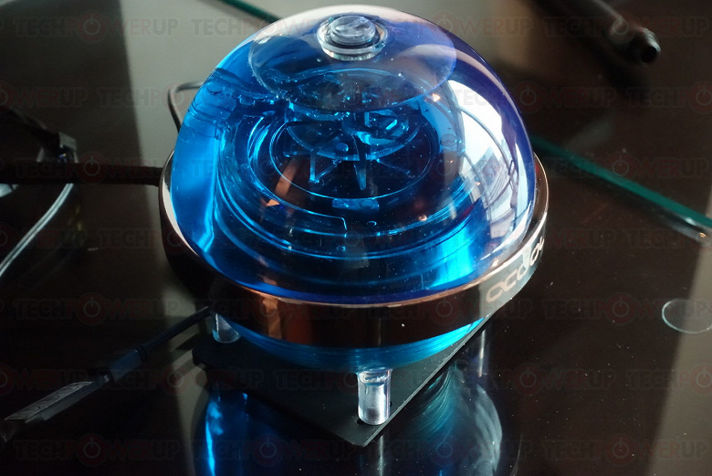 В прозрачном сферическом блоке установлена новая помпа VP755 V3, а по экватору проходит металлическое кольцо, в котором находится светодиодная подсветка.