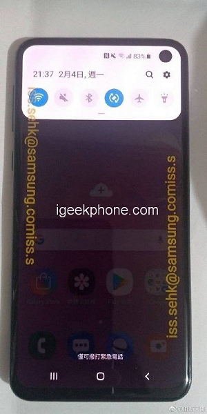 Источники опубликовали новую фотографию, на которой Samsung Galaxy S10e представлен целиком без каких-либо повреждений. Да, снова приходится согласиться с тем, что объектив фронтальной камеры на белом фоне меню быстрых настроек сильно бросается в глаза, но ситуация наверняка изменится в лучшую сторону с появлением темной темы в Android 10.