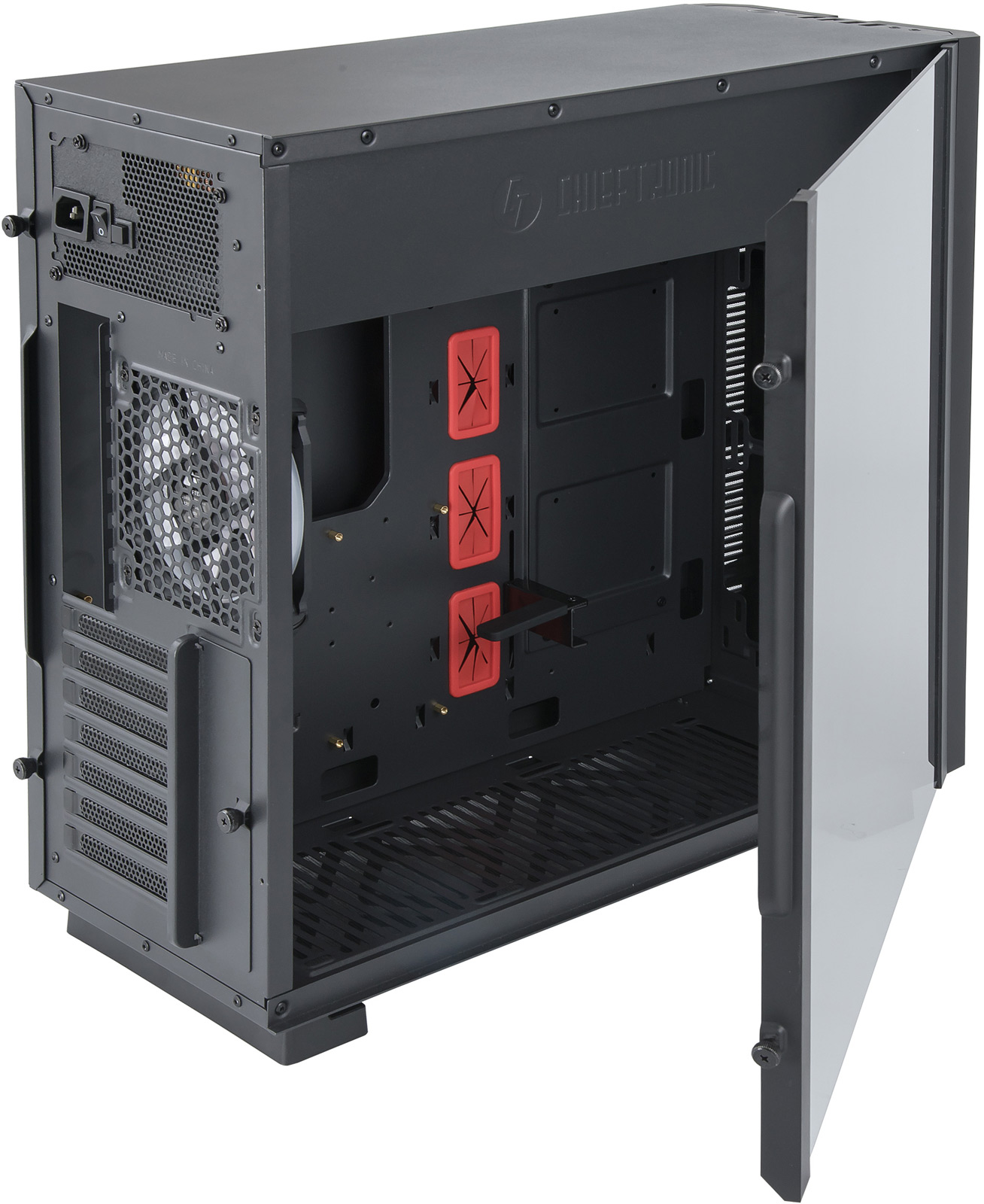 Корпус размерами 502 x 210 x 476 мм и массой 8 кг изготовлен из стального проката толщиной 0,8 мм, а боковая панель — из закаленного стекла.