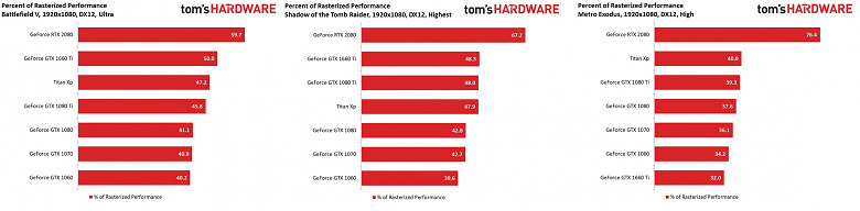 Они тестировали три игры: Battlefield V, Shadow of the Tomb Raider и Metro Exodus. К сожалению, за семейство GeForce RTX отдувалась лишь модель RTX 2080, что не позволяет сравнить результаты старших карт Pascal с младшей RTX 2060, но и без этого тестирование достаточно информативно.