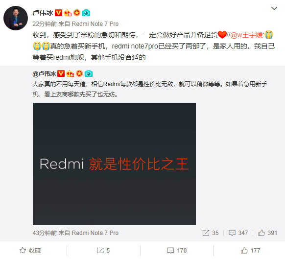 «Не нужно напоминать каждый день, я считаю, что каждый смартфон Redmi предлагается по очень адекватной цене, поэтому следует немного подождать. Если вам так нужен новый телефон, было бы интересно узнать, какой из них вы уже купили» — так ответил Лю Вейбинг пользователям Weibo. Свое сообщение он подкрепил картинкой: «Redmi — король стоимости».