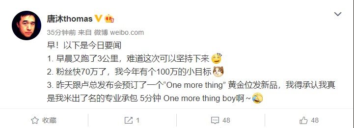 В своем сообщении, опубликованном в Weibo, Танг Му подтверждает, что потенциальный Redmi 855 выйдет в сопровождении некого продукта (на это указывает фраза One more thing), по слухам это будет ноутбук. С другой стороны, конкретно к ноутбукам Танг Му отношения не имеет, поэтому возможен анонс некого устройства умного дома.