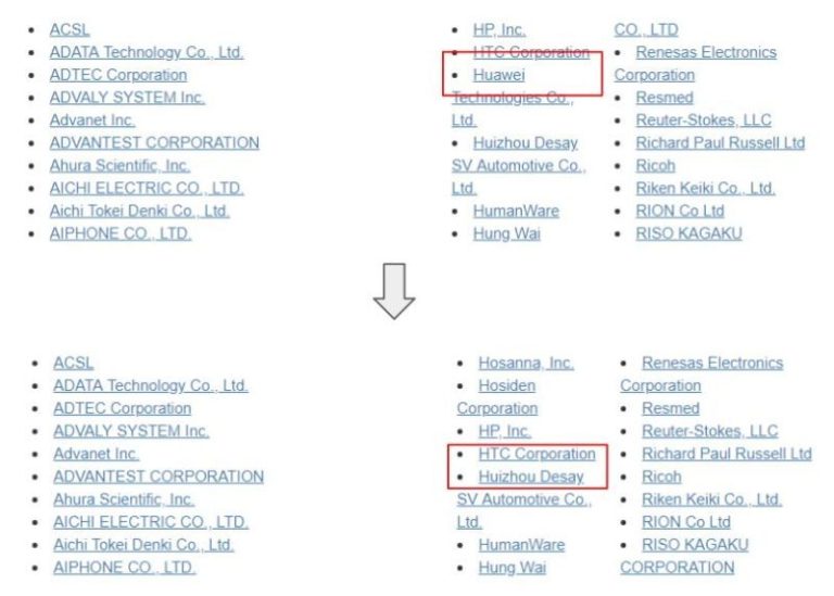 На скриншотах наглядно продемонстрирована «динамика»: вверху скриншот сайта, сделанный до включения администрацией Трампа Huawei в перечень компаний, с которыми запрещено вести бизнес. А внизу скриншот после запрета, в нем Huawei уже нет.