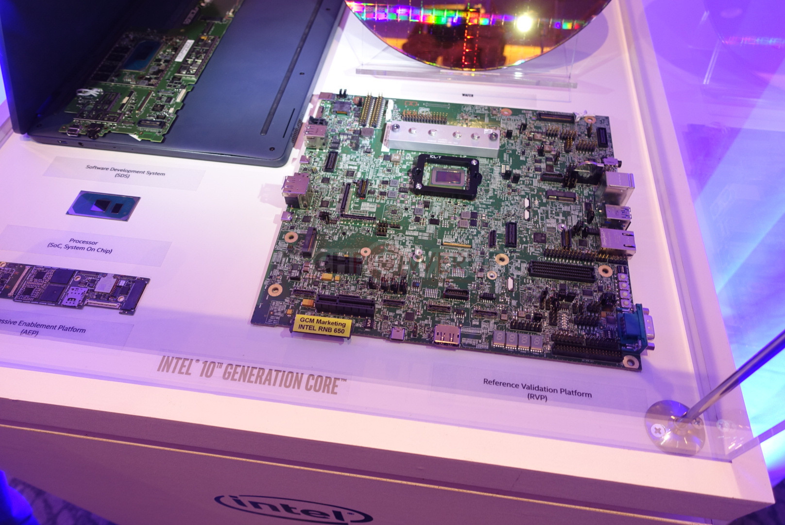 На объединительной плате с выводами BGA можно видеть два кристалла. Который побольше — это 10-нанометровый кристалл SoC Ice Lake с четырьмя ядрами Sunny Cove и iGPU GT2 Gen11. Рядом с ним находится кристалл PCH (концентратор контроллеров или чипсет).