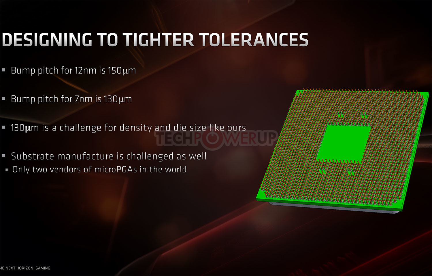 Конструкторы многокристального модуля Matisse смогли обеспечить полную совместимость на уровне выводов с процессорами Ryzen предыдущего поколения, то есть с разъемом AM4, который в свое время был выбран для однокристальных процессоров Pinnacle Ridge и Raven Ridge. Для решения этой задачи были разработаны новые контактные площадки размером 50 мкм, используемые для восьмиядерных кристаллов CPU, тогда как кристалл контроллера ввода-вывода имеет обычные площадки размером 75 мкм. В отличие от графических процессоров, которым требуется больше соединений между кристаллом GPU и памятью HBM, в процессорах AMD Ryzen 3000 удалось соединить кристаллы без объединительной кремниевой пластины с межслойными соединениями (TSV). Кристаллы смонтированы на 12-слойной подложке.