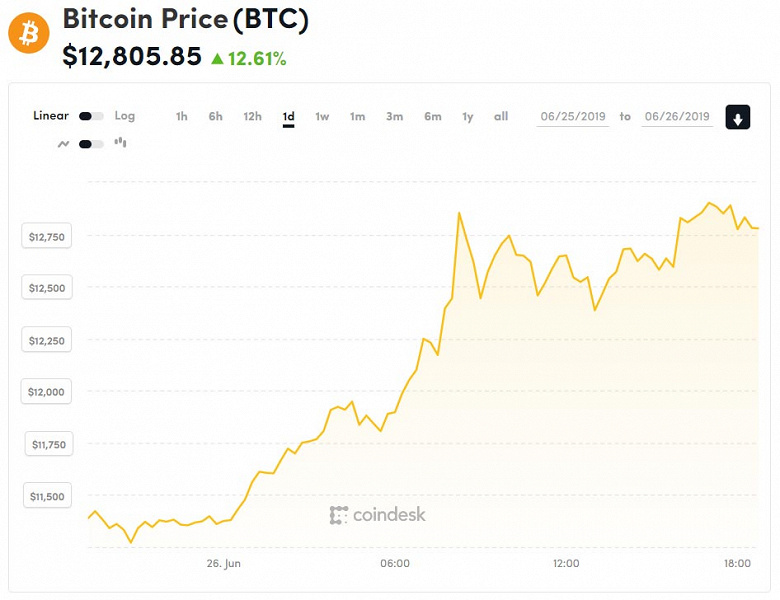 Если быть точным, было зафиксировано значение 12 920,63 доллара, а на момент написания новости курс составляет 12 805,85. Отметим, что это наибольший уровень за последние полтора года.