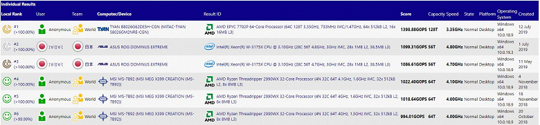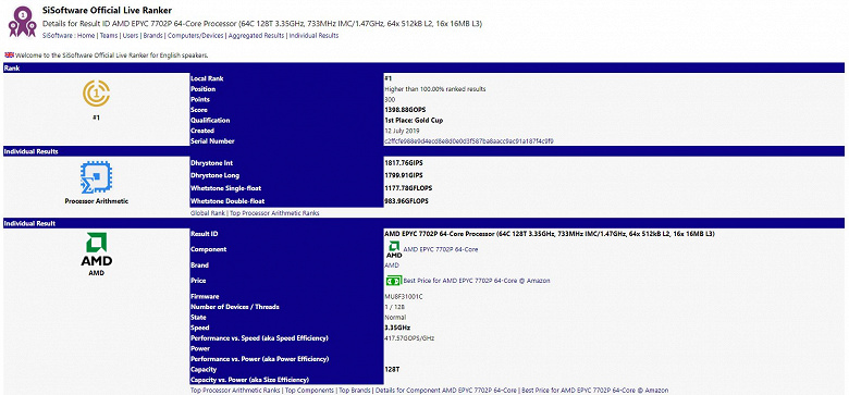 64-ядерный процессор AMD Epyc 7702P возглавил рейтинг SiSoftware, значительно опередив Intel Xeon W-3175X и AMD Ryzen Threadripper 2990WX