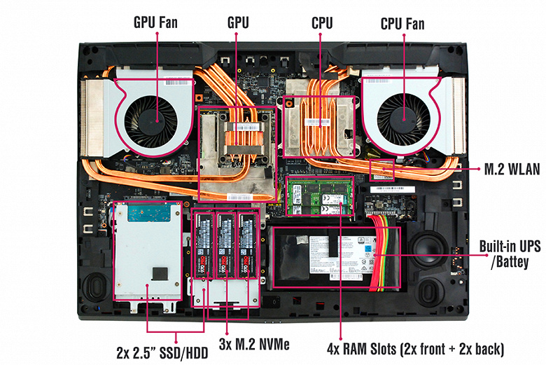 Что касается параметров, сердцем ноутбука могут служить процессоры Core i7-9700K, Core i9-9900K, Xeon E-2176G либо Xeon E-2185G. Что касается видеокарты, на выбор есть GeForce GTX 1060, Quadro P3200, P4200 либо P5200. Оперативной памяти может быть от 32 до 128 ГБ. А вот подсистема хранения данных действительно впечатляет. Ноутбук можно оснастить пять накопителями! Три из них — это SSD объёмом от 250 ГБ до 2 ТБ, два оставшихся — HDD объёмом от 1 до 8 ТБ. В итоге можно собрать ноутбук с хранилищем суммарным объёмом 22 ТБ!