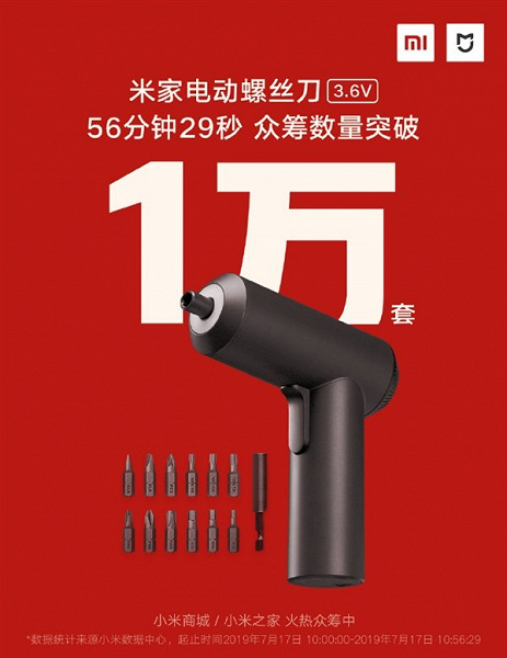Только сегодня утром компания Xiaomi объявила сбор средств на своей платформе коллективного финансирования на электрическую отвертку Mijia Electric Screwdriver — и вот уже пришел отчет, демонстрирующий, насколько устройство популярно: за 56 минут и 29 секунд было собрано 10 000 заказов на эту новинку. Участникам программы коллективного финансирования устройство достанется за $23, а вот в рознице оно будет предлагаться уже за $29.