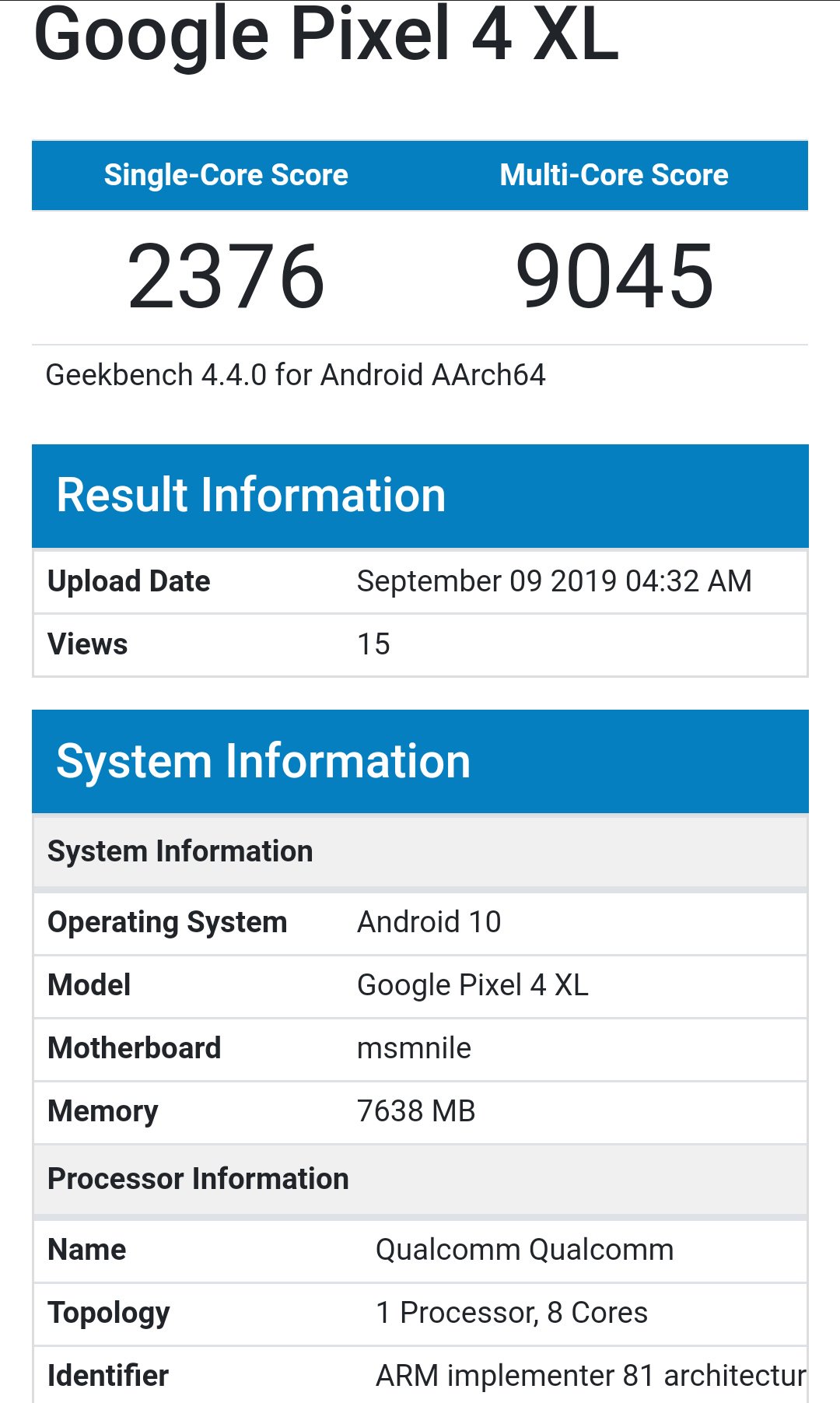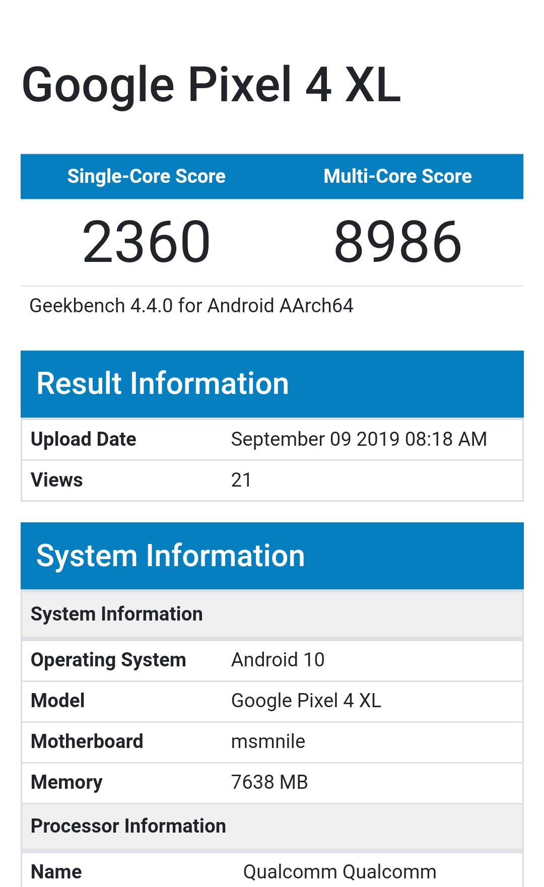 Как видно на свежих тестах в Geekbench, Google Pixel 4 XL получил полноценные 8 ГБ ОЗУ — столько же, сколько и у других флагманов. Аппарат работает под управлением ОС Android 10 (на ранних прототипах она определялась как Android Q) и построен на SoC Snapdragon 855.