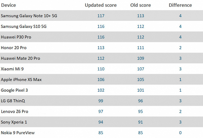 Как можно видеть, большинство получили прибавку в 1-4 балла, хотя Nokia 9 PureView не получила ни одного. В итоге сейчас лидером является Samsung Galaxy Note10+ 5G, который и по общему баллу обходит Huawei P30 Pro, и отдельно по баллам за качество фото и видео.
