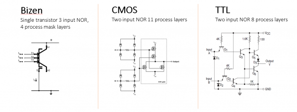 Разработчики не побоялись фундаментальных изменений на уровне транзисторов и вернулись на пять десятилетий назад, когда еще не господствовала технология CMOS и полевые транзисторы. Новый процесс под названием Bizen построен на использовании биполярных транзисторов и принципов квантовой туннельной механики. По сравнению с CMOS, Bizen приводит к пятикратному сокращению времени выполнения заказа - с нынешних пятнадцати недель до трех. Кроме того, новый процесс обеспечивает трехкратное увеличение плотности компоновки затворов, что соответствует трехкратному уменьшению размеров кристалла. Наконец, Bizen уменьшает вдвое количество необходимых технологических слоев. При этом достигаются показатели быстродействия и энергопотребления, свойственные современным изделиям, изготавливаемым по технологии CMOS.