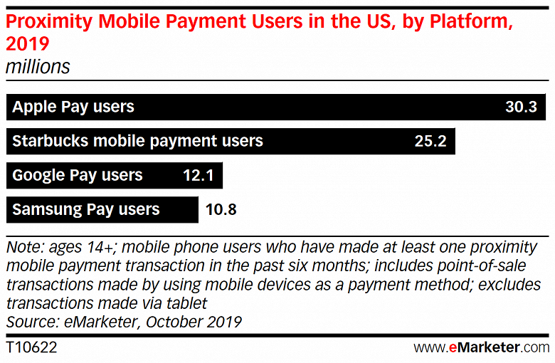 Но по итогам прошлого года сервисом Apple Pay воспользовалось 27,7 млн жителей США. Ожидается, что по итогам текущего года количество пользователей Apple Pay в США вырастет до 30,3 млн, благодаря чему на купертинский сервис придётся 47,3% всех мобильных платежей в США. Для сравнения, пользователей мобильного кошелька Starbucks по итогам текущего года будет около 25,2 млн.