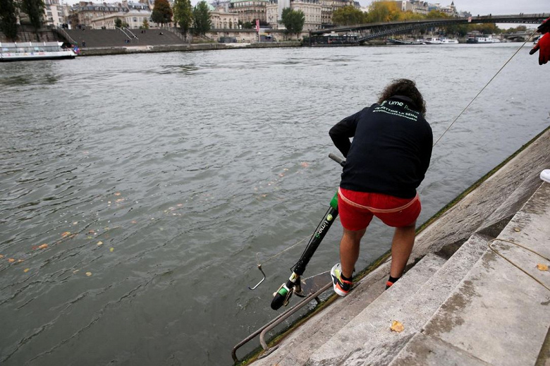 Эти люди, работающие в сервисе проката Lime, вылавливают из Сены брошенные в реку двухколесные транспортные средства. Для этого они используют прочные веревки с металлическими крюками на конце. Каждый день из воды извлекаются десятки покрытых грязью и водорослями самокатов.