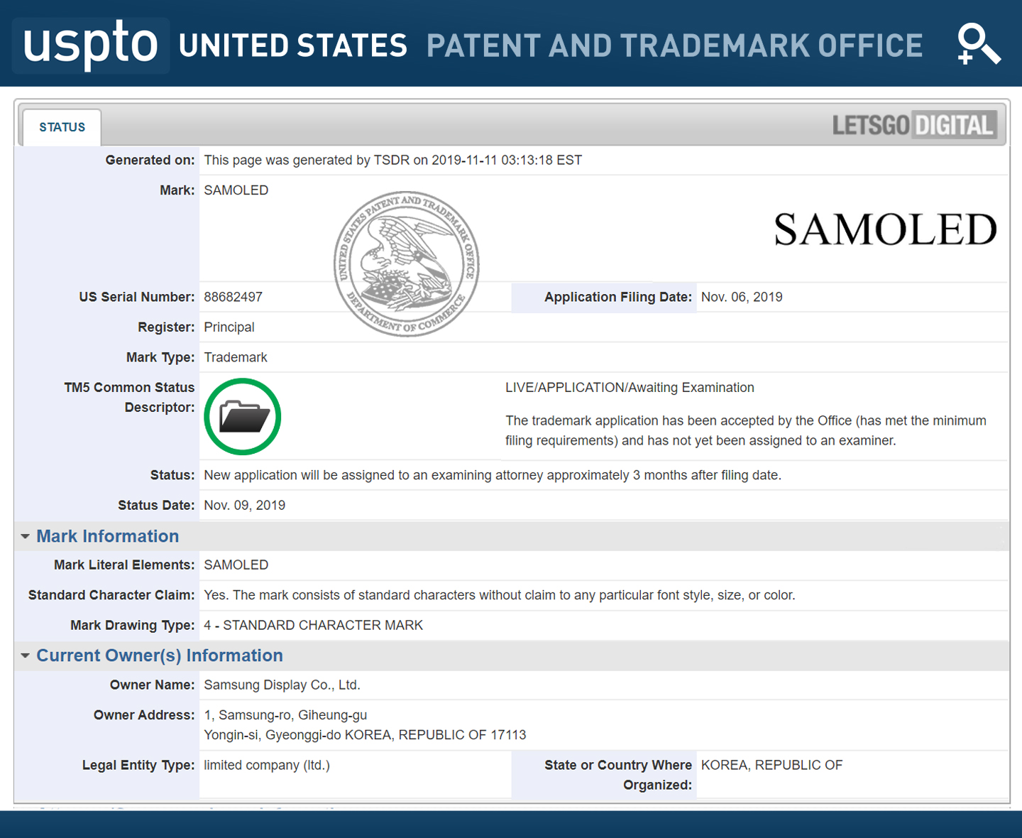 Компания Samsung Display подала заявки на новую торговую марку в Бюро по интеллектуальной собственности Южной Кореи (Korean Intellectual Property Office, KIPO) и Управление США по патентам и торговым маркам (United States Patent and Trademark Office, USPTO).