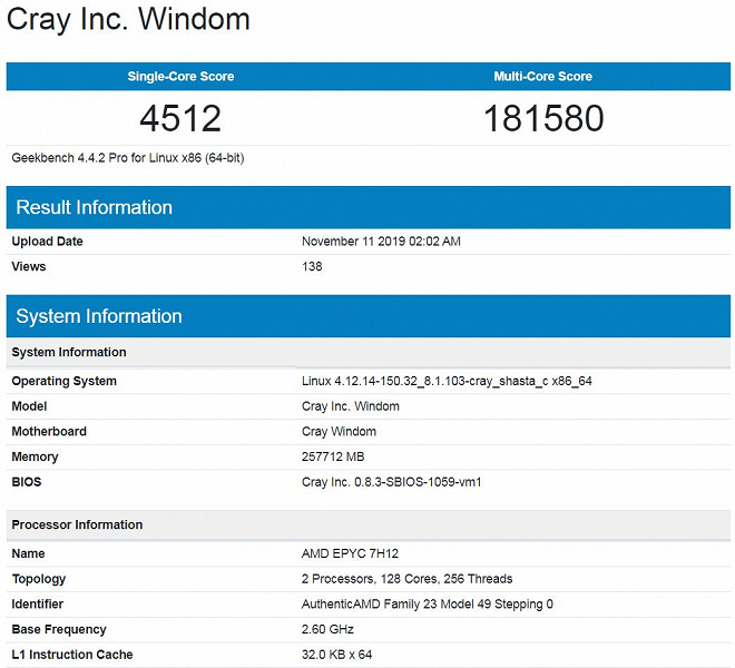 В базе результатов теста Geekbench 4 появились данные, соответствующие суперкомпьютерному серверу Cray Windom на двух процессорах AMD Epyc Rome 7H12. В тесте одноядерной производительности показатель системы равен 4512 баллам, многоядерной — 181580 баллам.