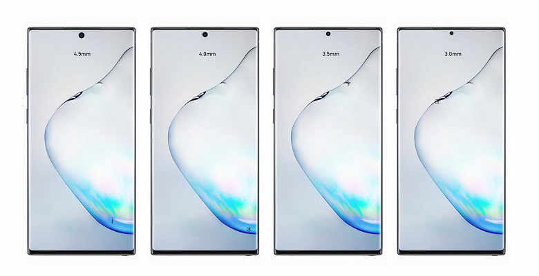 От отметил, что размер такого отверстия постепенно будет становиться всё меньше — от 4,5 мм в осеннем флагманском смартфоне Samsung Galaxy Note10, к 4 мм, затем 3,5 мм и даже 3 мм. Для наглядности, он опубликовал рендер, где сравниваются такие экраны.