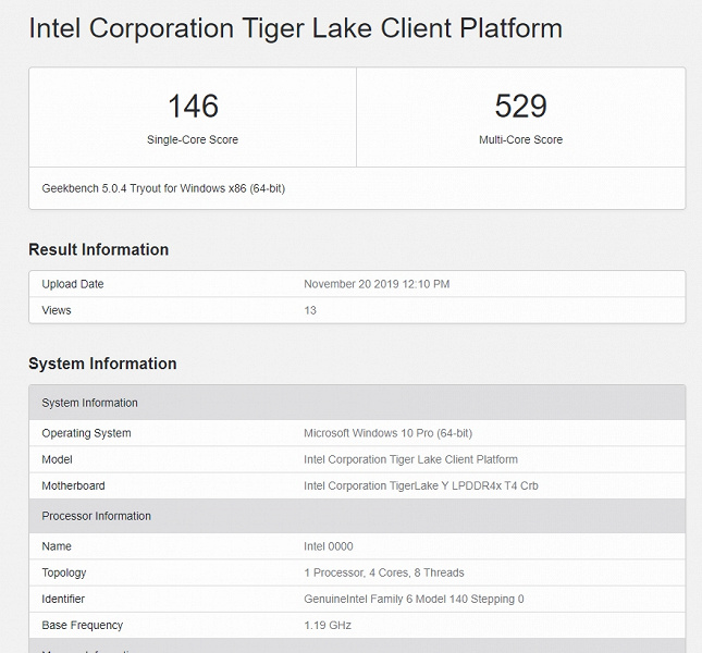 Что касается показателей в тесте, тут сравнивать сложно, потому что в базе Geekbench ещё нет данных процессоров Ice Lake-Y. К тому же показатели слишком уж низкие, что может указывать на участие в тестировании раннего образца.