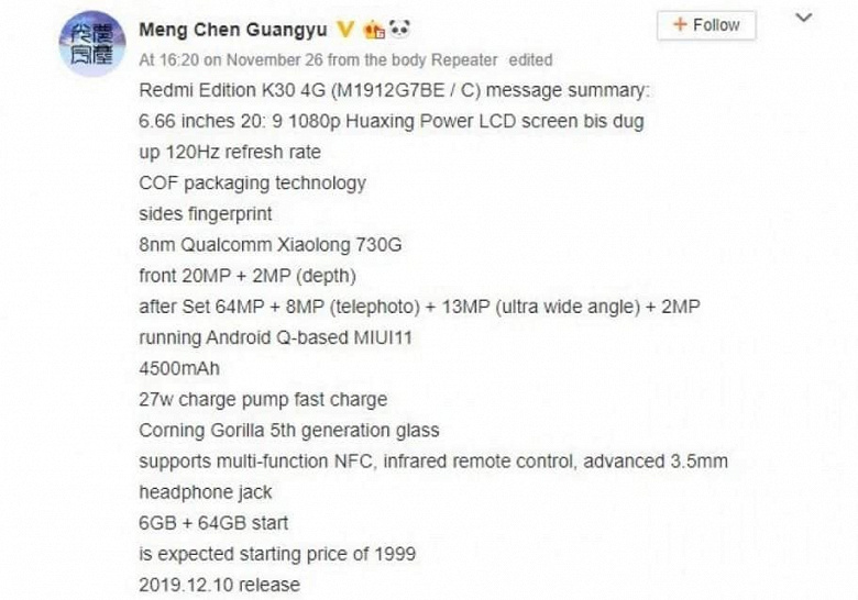 В глаза бросается несоответствие данных емкости аккумуляторной батареи: китайский блогер пишет о 4500 мА·ч, а индийский – о 5000 мА·ч. Также китайский источник говорит о применении в смартфоне закаленного стекла Gorilla Glass 5. И, наконец, самое главное – цена. В базовой версии Redmi K30 (в исполнении без поддержки 5G) предложит 6 ГБ ОЗУ и 64 ГБ флэш-памяти – за такой смартфон попросят $285. Это немного для модели, оснащенной экраном с кадровой частотой 120 Гц, квадрокамерой с основным датчиком разрешением 60 Мп и сдвоенной фронтальной камерой с датчиками разрешением 20 и 2 Мп. Но в остальном больше ничего нового: Redmi K30 в LTE-версии, построенный на SoC Snapdragon 730G, недалеко уйдет от Redmi K20.