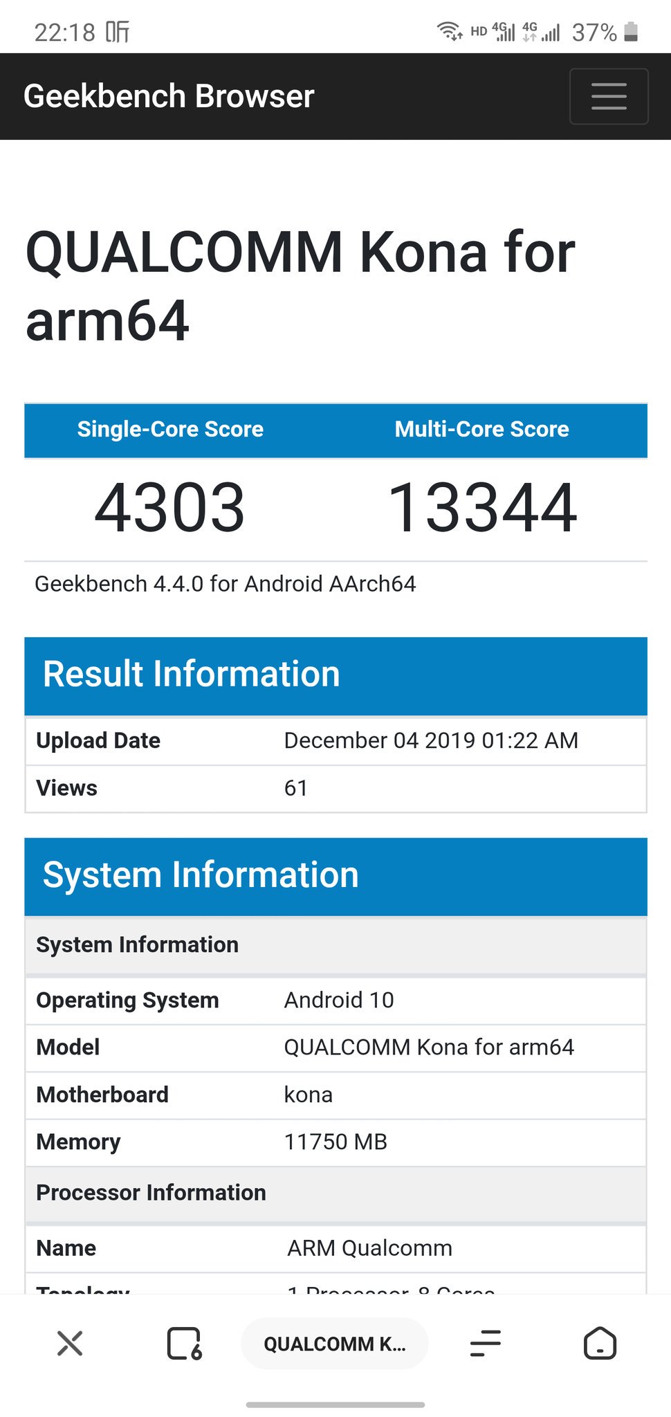 Как видим, она впечатляет. 4300 баллов в однопоточном режиме и 13 300 баллов — в многопоточном. Это намного больше, чем демонстрирует Snapdragon 855, особенно в однопоточном режиме. Вероятнее всего, количество ядер у новой платформы осталось неизменным, а вот сами ядра стали намного мощнее.