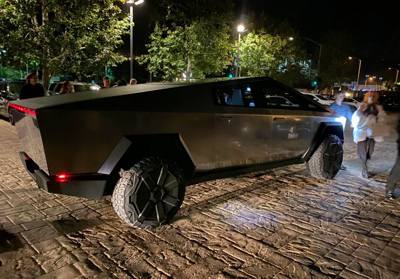 Это один из первых случаев, когда Cybertruck заметили живьём на дороге. И, явно, первый с «настоящим» Маском внутри, да ещё и в ночных условиях.