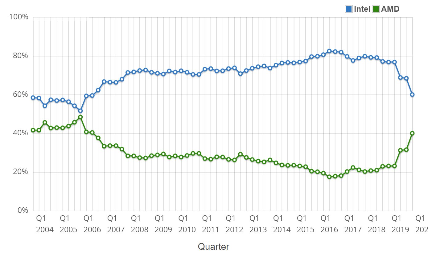 Как можно видеть, на 1 января 2020 года доля AMD составляла 40%, доля Intel — 60%. Так как это данные бенчмарка, их не стоит воспринимать, как статистику продаж. В данном случае важно то, что в прошлый раз аналогичный результат AMD имела почти 15 лет назад — в 2006 году!