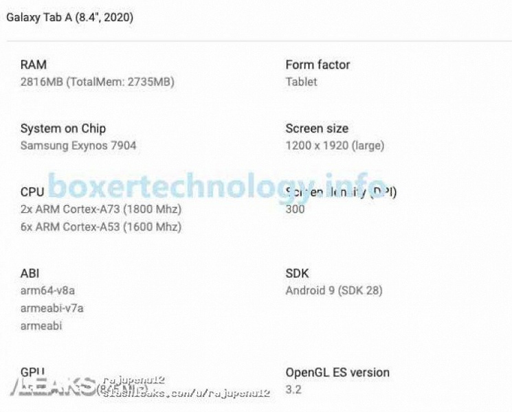 Устройство должно быть оснащено экраном диагональю 8,4 дюйма разрешением 1920 х 1200 пикселей. В качестве однокристальной системы будет выступать Samsung Exynos 7904.