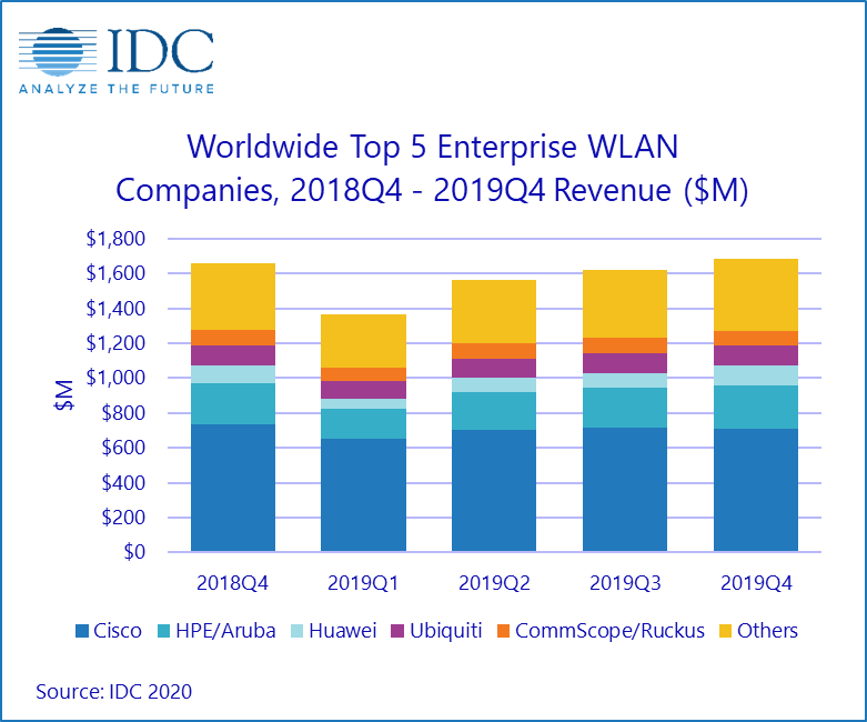 Лидером рынка оборудования для корпоративных сетей WLAN осталась компания Cisco, которой по итогам года принадлежит 44,6% рынка. На втором месте находится Aruba-HPE с 13,9%. Третье место занимает Ubiquiti с 7,0%. Компания Huawei в 2019 году заняла 5,5% рынка. Компания CommScope, ранее известная как ARRIS/Ruckus, замыкает первую пятерку с 5,3%.