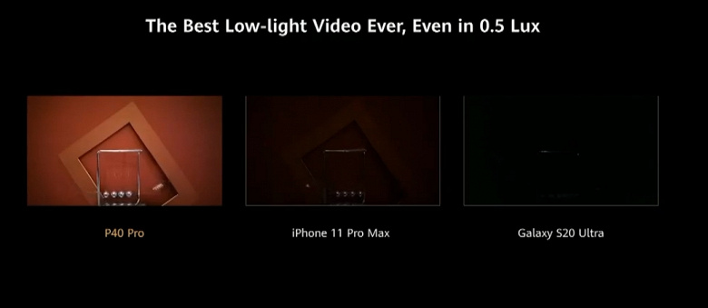 Съёмка при плохом освещении должна быть ещё одним коньком новинок Huawei. Компания показала пример видео, снятый при освещённости в 0,5 люкса, и конкурирующие смартфоны в такой ситуации оказались почти слепы.