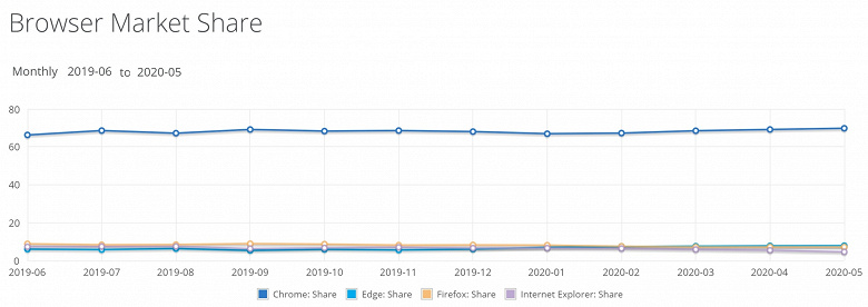 Фирменный браузер Google продолжает уверенно доминировать и усиливать своё превосходство. На долю Chrome уже приходится 69,81% — новый рекорд после апрельских 69,18%. Microsoft Edge слегка вырос с 7,76% to 7,86%, а вот доля Firefox на третьем месте снизилась с 7,25% до 7,23%.