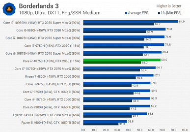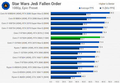 В итоге получаем ситуацию, когда 115-ваттная RTX 2060 может быть быстрее, чем 80-ваттная RTX 2080, а уж между более близкими картами порой вообще выбирать бессмысленно, потому что они показывают чуть ли не идентичные результаты. То есть, желая купить геймерский ноутбук, к выбору стоит подходить намного более серьёзно, чем в случае геймерского ПК, и порой далеко не обязательно переплачивать 100-200, а то и 500 долларов за модель с якобы более мощной видеокартой, потому что на практике она может оказаться в лучшем случае лишь на несколько процентов быстрее.