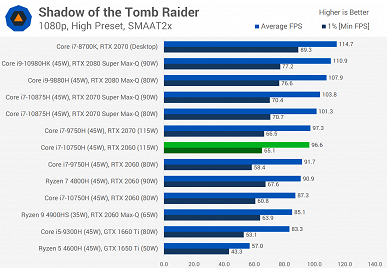 Как можно видеть, у некоторых моделей диапазон TDP и частот очень велик. Поэтому мобильная RTX 2060 в одном ноутбуке может оказаться намного быстрее, чем такая же карта в другом. Конечно, не стоит забывать и о разных CPU, но в случае ноутбуков от этого никуда не деться, да и к тому же большинство игр до определённого предела не особо чувствительны к процессорной производительности.
