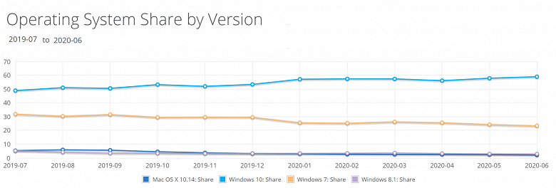 Доля Windows 10 выросла за месяц с 57,83% до 58,93%, а доля Windows 7 продолжает падать — с 24,28% в мае до 23,35% июне. Общая доля ОС Windows составляет 86,69%. При этом доля macOS снизилась с 9,68% до 9,22%, а Linux выросла с 3,17% до 3,61%. На долю ChromeOS пришлось только 0,41%.