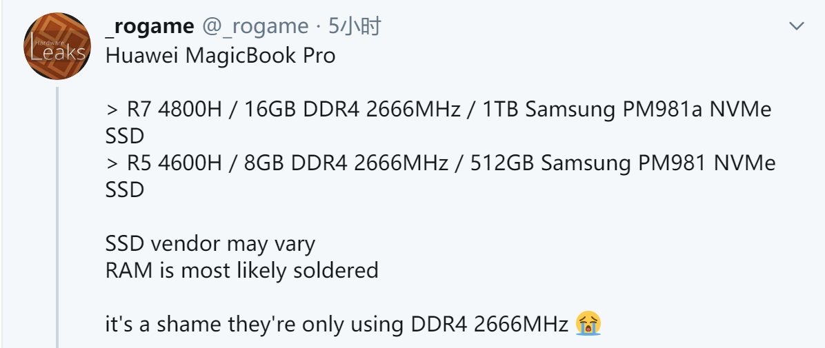 Показательно, что в Honor сделали ставку на процессоры серии H – с большим TDP, но и большим быстродействием. Ноутбуки будут предлагаться под соусом игровых, но пока непонятно, будет ли дискретная видеокарта: ранее этим устройствам приписывали одну или несколько моделей GeForce RTX 20, но инсайдер пока эти данные не подтверждает. Зато известно, что в старшей модели будет 16 ГБ ОЗУ и SSD объемом 1 ТБ, а в младшей – 8 ГБ ОЗУ и SSD объемом 512 ГБ. В качестве SSD выступил Samsung PM981, но наверняка будут аналоги от других поставщиков.