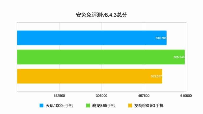 Как можно видеть, в AnTuTu решение MediaTek идёт вровень с SoC Kirin 990, уступая Snapdragon 865. При этом Exynos 990 в смартфонах линеек Galaxy S20 и Note20 в этом тесте набирает около 510 000 баллов, то есть уступает Dimensity 1000+.