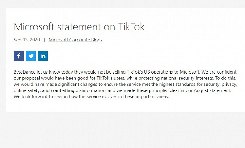 Компания Microsoft официально сообщила о том, что уже не является претендентом на покупку социальной сети TikTok в США – ее предложение было отвергнуто владельцем TikTok компанией ByteDance. В своем сообщении Microsoft отмечает, что предприняла «серьезные изменения, чтобы обеспечить соответствие сервиса высочайшим стандартам безопасности, конфиденциальности, онлайн-безопасности и борьбы с ложной информацией». Сама ByteDance причины отказа не раскрывает, но слухи о том, что сделка между ней и Microsoft все-таки не состоится, в китайских СМИ ходят уже несколько недель.