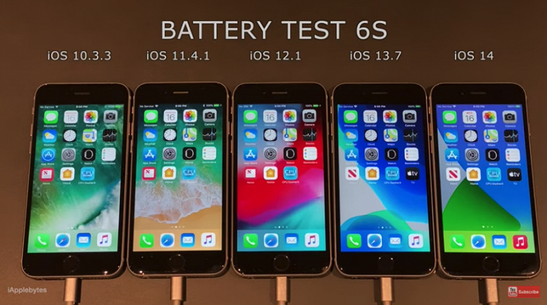 Ролик опубликовали на канале YouTube под названием iAppleBytes. На видео сравнивается время автономной работы iPhone 6s с установленными iOS 14 to iOS 13.7, 12.1, 11.4.1 и 10.3.3. Все смартфоны были заряжены на 100% в начале теста, отключена автоматическая настройка яркости, яркость установлена на 25%. Состояние аккумцляторов тоже было оптимальным — максимальная ёмкость у всех устройств составляла 100%.