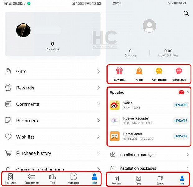 Вкладка Manager (Управление) раньше использовалась для управления установленными приложениями и проверки обновлений. Теперь она убрана. Функции управления с вкладки перемещены в секцию в профиле, а подарки, награды и комментарии — над разделом с обновлениями.