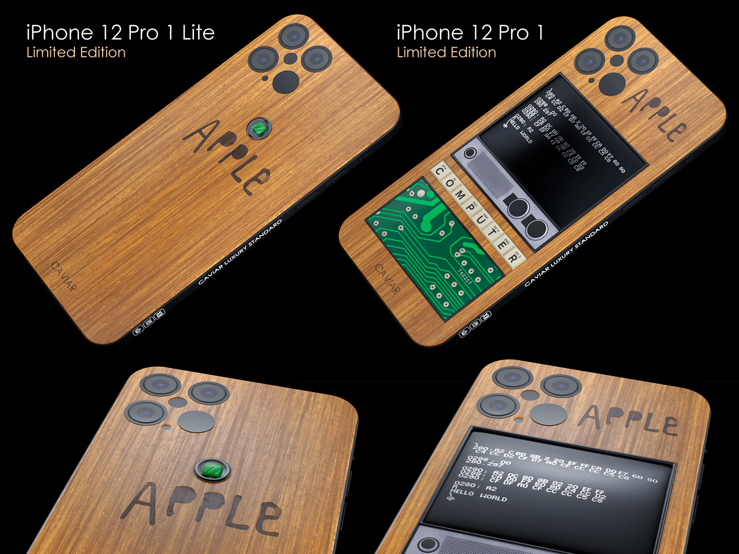 Компьютер Apple 1 был выпущен в 1976 году, он получил деревянный корпус и смешной логотип Apple. Caviar взяла за основу эти дизайнерские элементы при создании iPhone 12 Pro Apple 1 Edition.