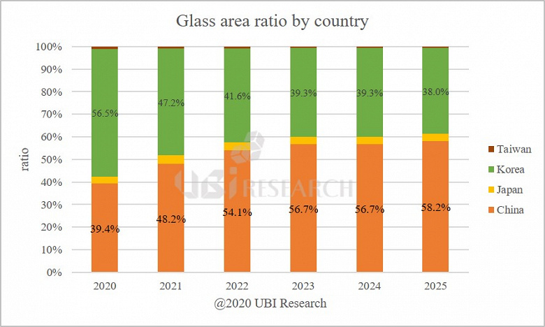 Аналитики UBI Research прогнозируют, что китайские производители превзойдут своих южнокорейских конкурентов по суммарной площади панелей OLED, выпущенных за год, уже в будущем году. Доля южнокорейских компаний, сейчас равная 56,5%, сократится до 47,2%, а доля китайских компаний одновременно увеличится с 39,4% до 48,2%. Тенденция сохранится и в последующие годы, так то уже в 2022 году доля Китая превысит половину. Наглядно прогноз показан на диаграмме.