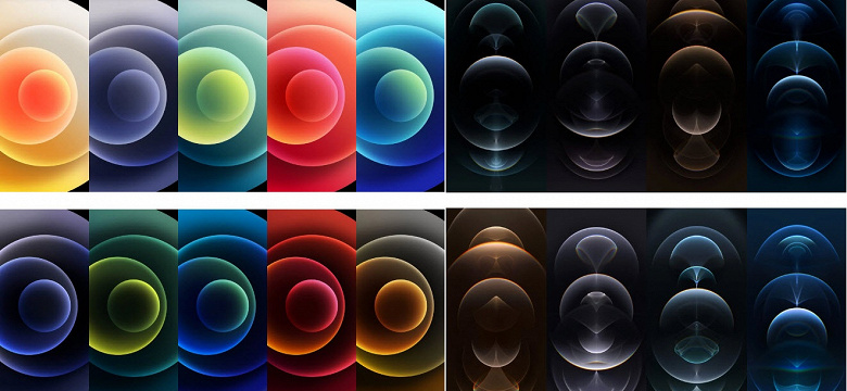 Apple предложила пользователям iPhone 12 и 12 Pro разный набор обоев. iPhone 12 поставляется с десятью обоями для использования в темном и светлом режиме. iPhone 12 Pro имеет восемь разных обоев для тёмного и светлого режима. Все обои сочетаться с разными цветами, в которых доступны iPhone 12 и iPhone 12 Pro.
