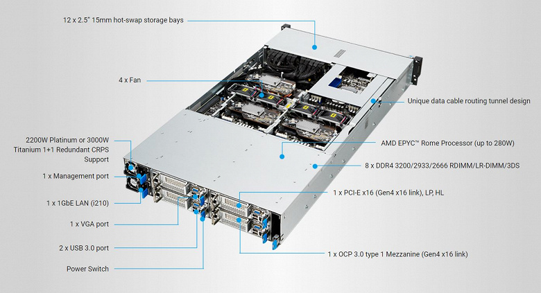 Конфигурация RS620SA-E10-RS12 включает шесть 64-ядерных процессоров AMD EPYC 7002, каждый из которых располагает слотом PCIe 4.0 x16 и слотом OCP 3.0. В слот PCIe 4.0 x16 можно установить низкопрофильную видеокарту, такую как Nvidia T4, для ускорения работы приложений, связанных с логическим выводом и искусственным интеллектом.
